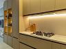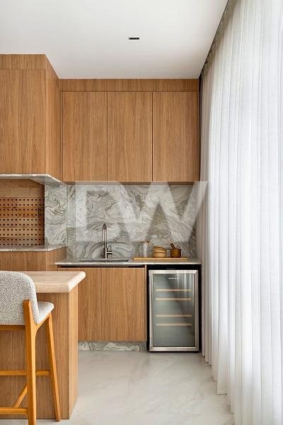 O living integra uma churrasqueira a carvão de grandes dimensões, acabamentos em travertino romano e bancadas em pedras especiais ultracompactas Laminam. A cozinha é completa, equipada com coifa, fogão, cooktop e lava-louças.